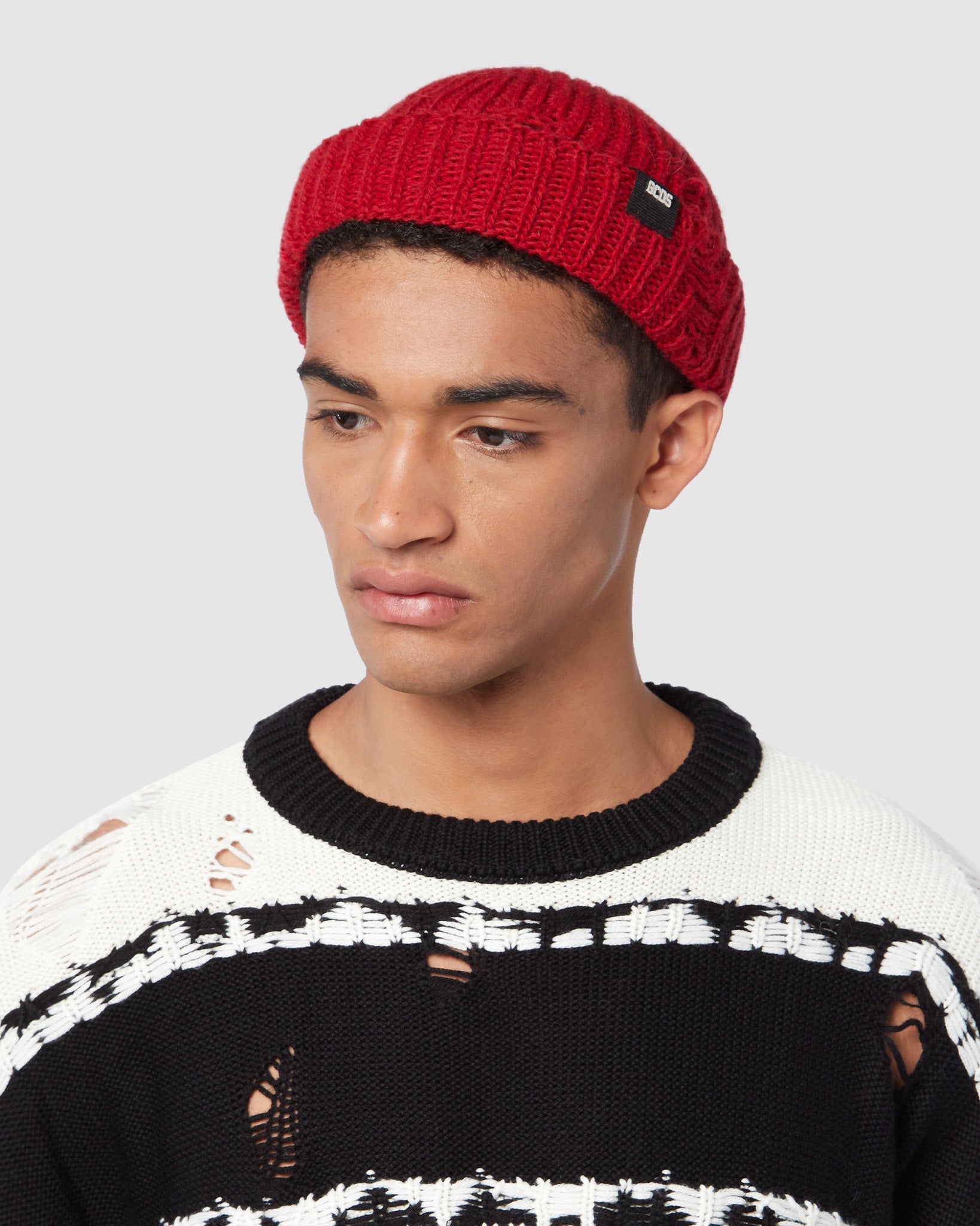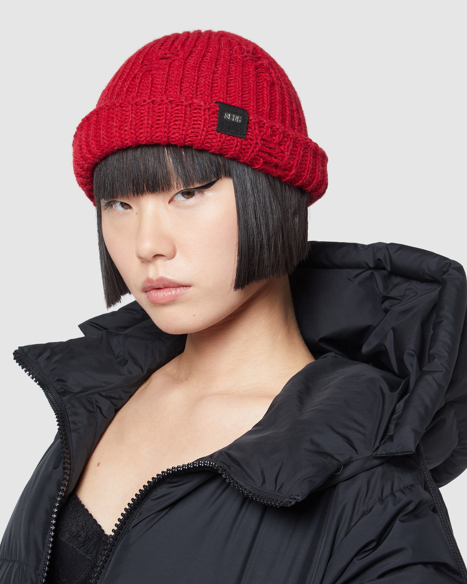 Wool and soft mohair blend ribbed beanie with bold cuff. Scattered rips and grosgrain band with polished nickel logo plaque.