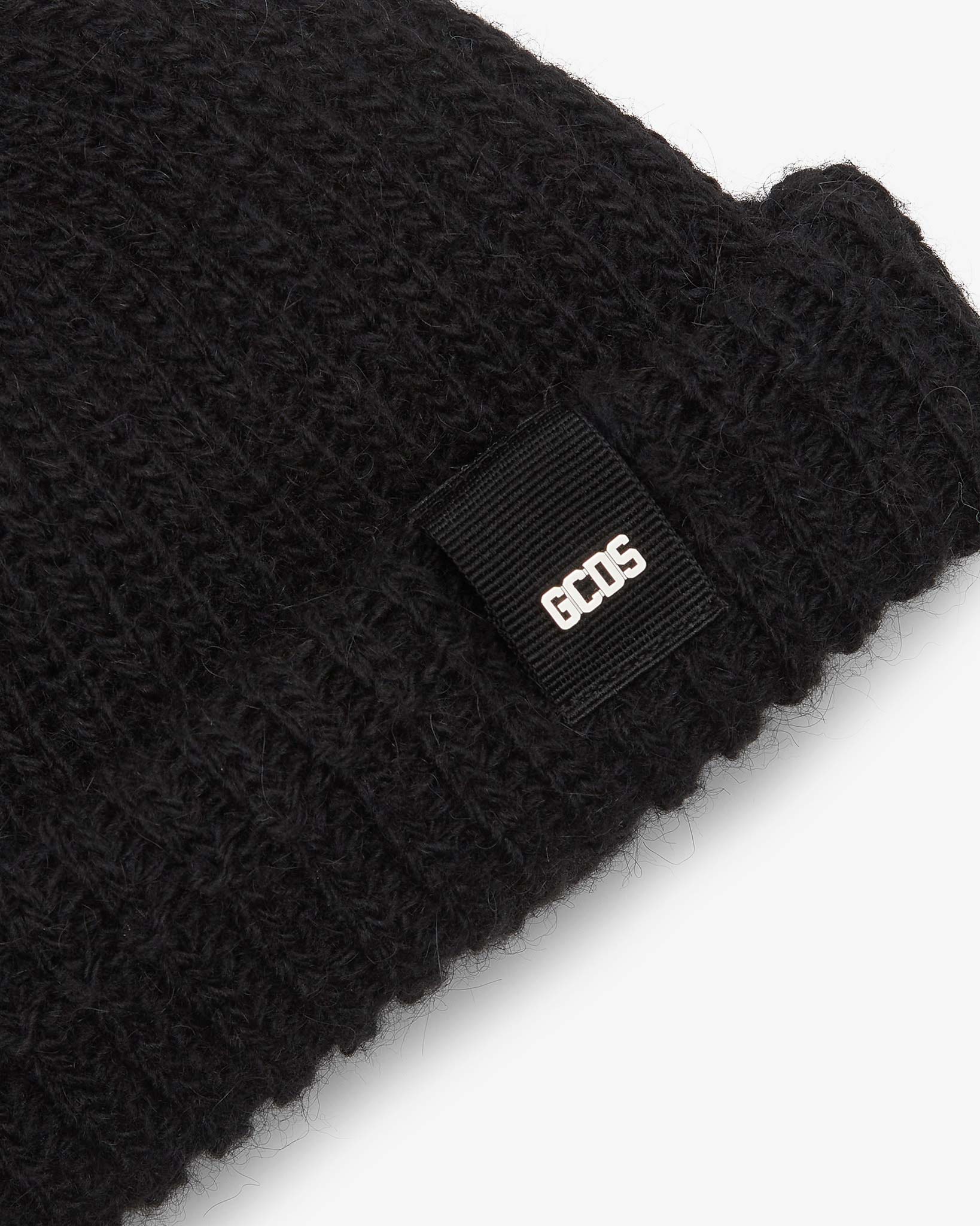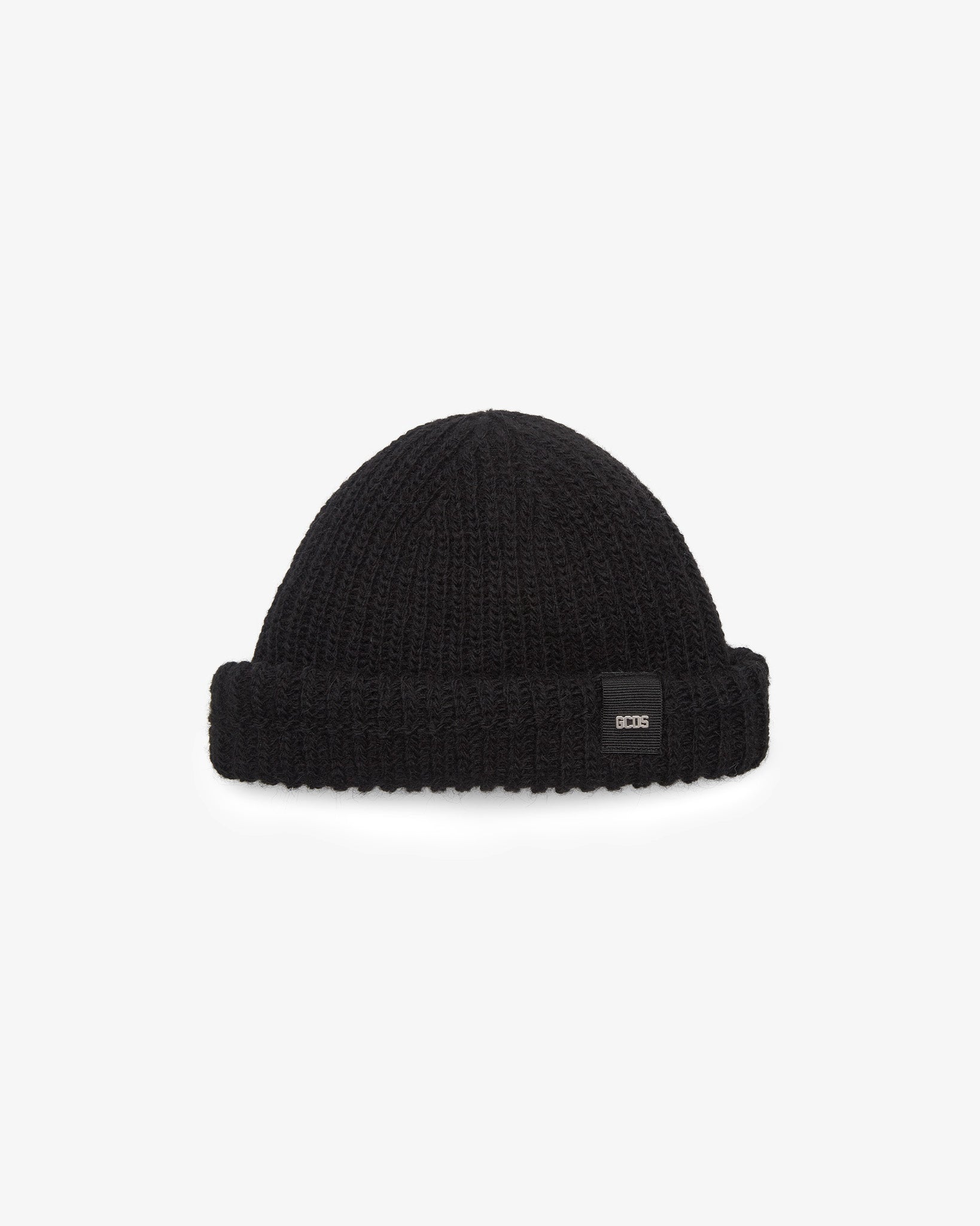 Wool and soft mohair blend ribbed beanie with bold cuff. Grosgrain band with polished nickel logo plaque.