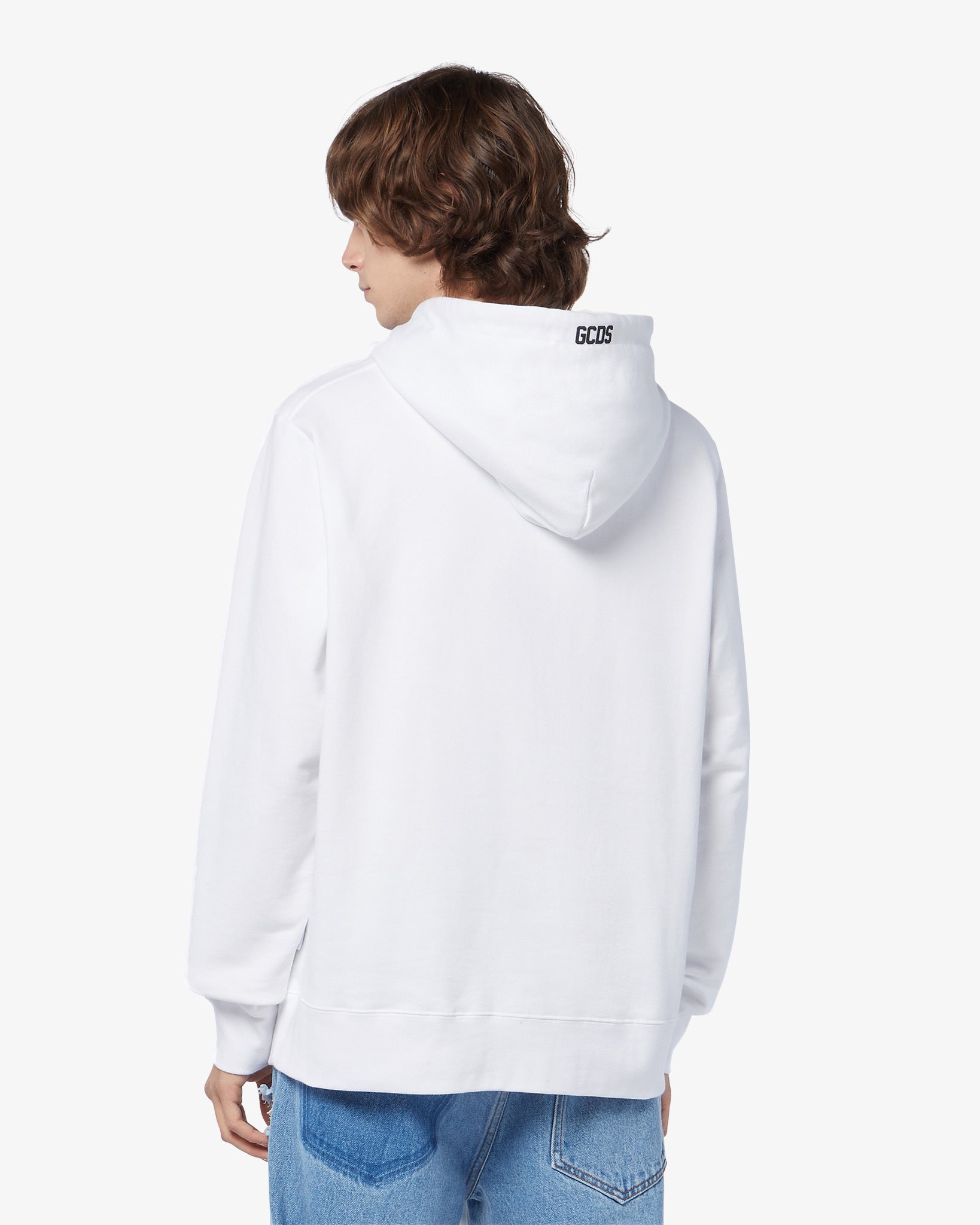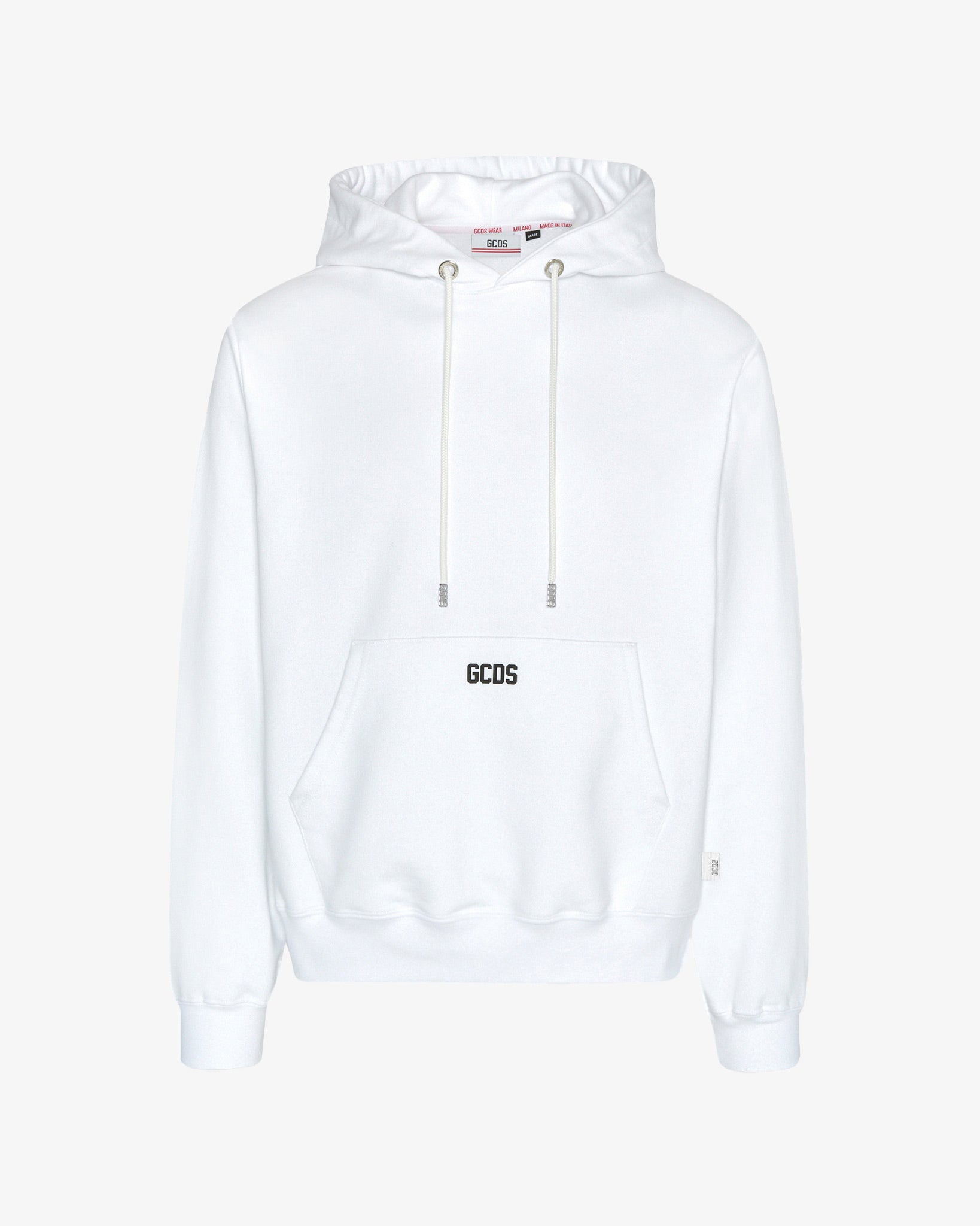 Long-sleeved organic cotton sweatshirt with adjustable hood. GCDS logo appliqué on the center of the pouch pocket and at the back, on the center of the hood. Oversized fit.