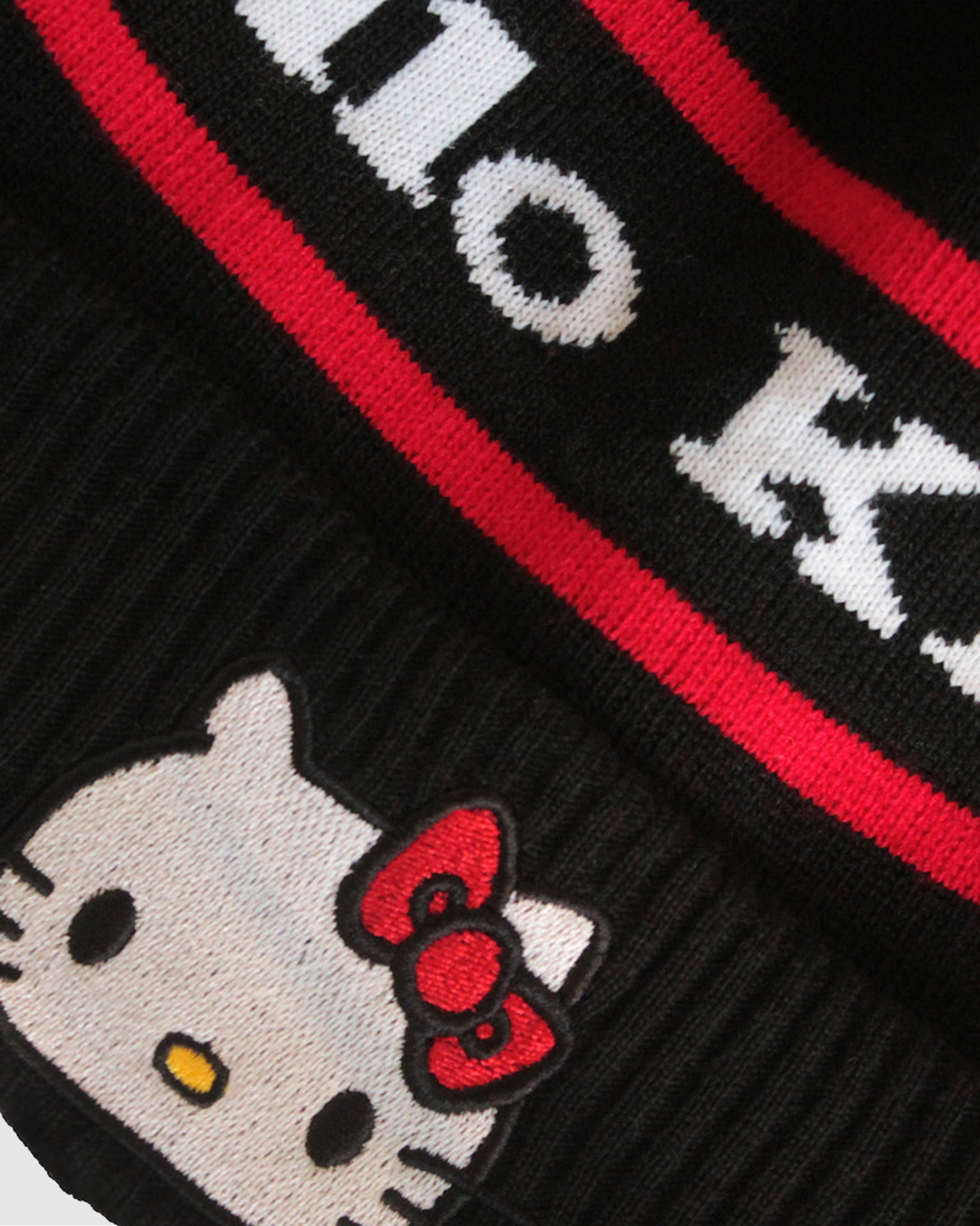 Wool blend beanie with Hello Kitty jacquard artwork. Ribbed turn-up with Hello Kitty patch appliquéd on the front. Contrasting GCDS embroidery on the center back. Contrasting pompom.